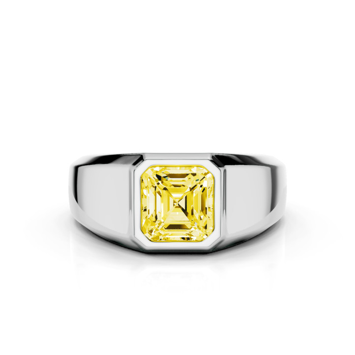 2.00 carat signet ring with a yellow lab grown asscher cut diamond in white gold